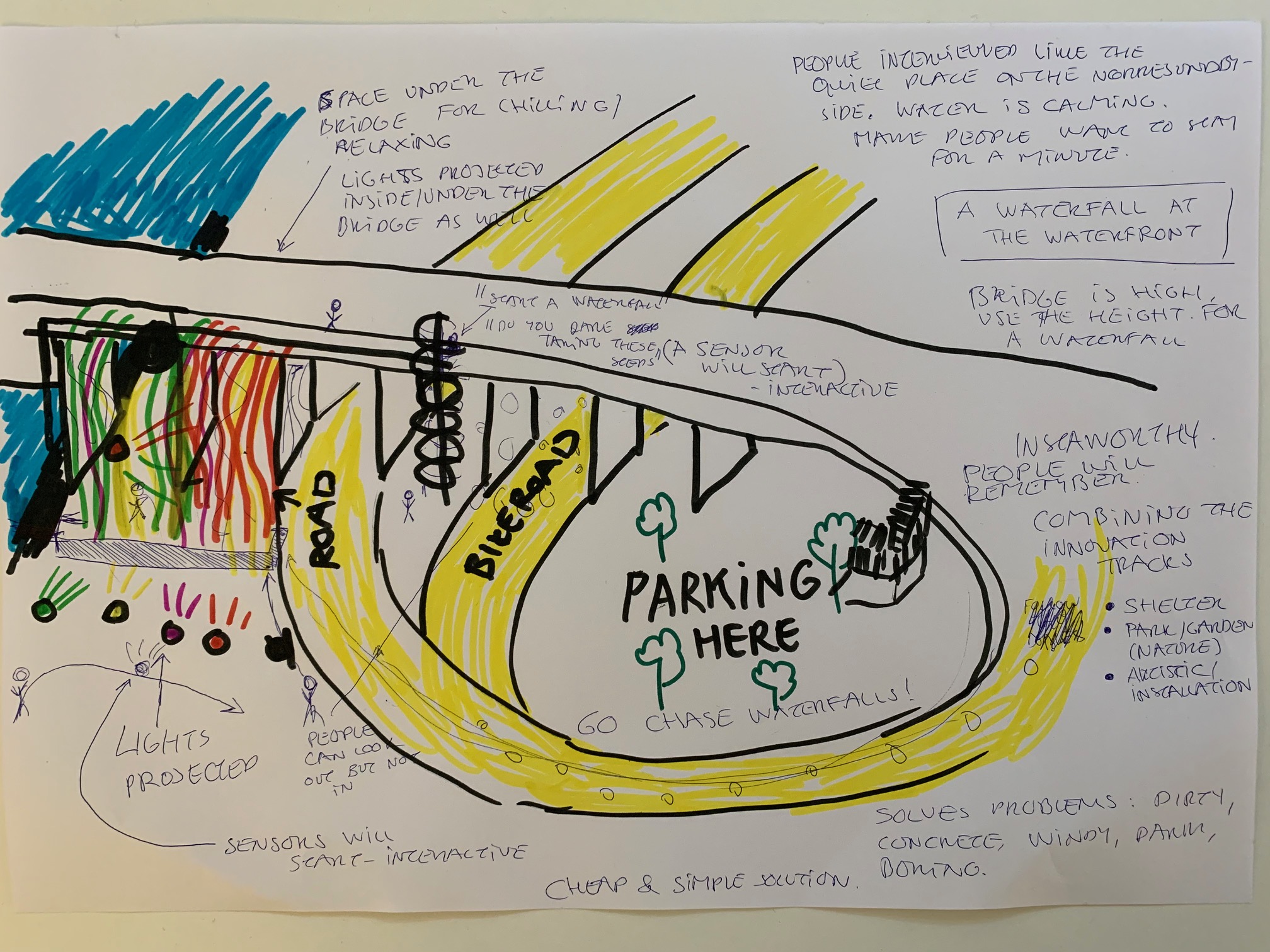 Day 1… On the first day we were divided in groups consisting of two students from each of the master’s degrees; Entrepreneurial Engineering, Interactive Digital Media and Experience Design. We were handed our case description and started brainstorming and preparing questions for our case partner, Aalborg Municipality. Talking to the two representatives from Aalborg Municipality gave us a short insight into the different challenges they are facing regarding the area under the bridge on the Nørresundby side.