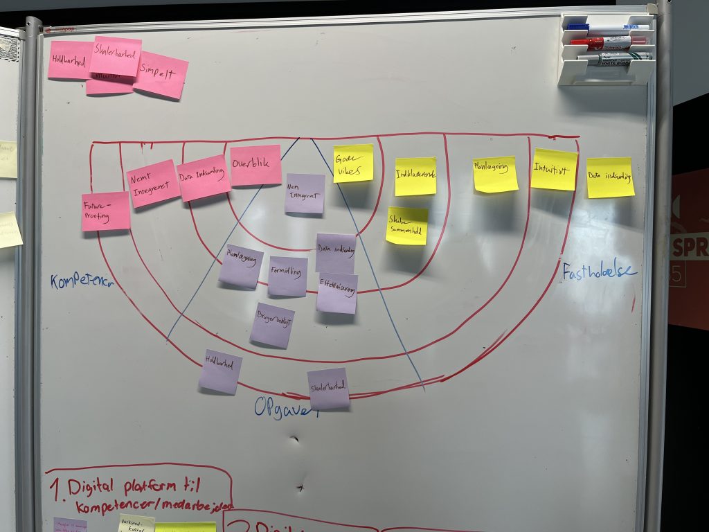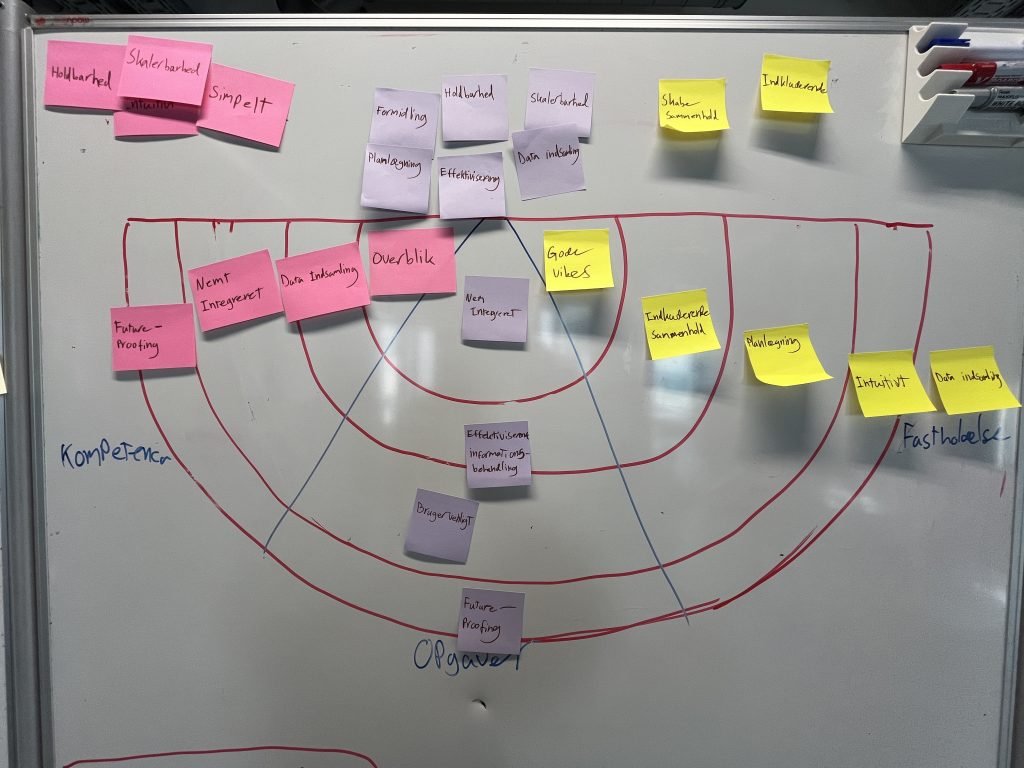 Resultat af diskussion om coredesign. I starten af core design-processen satte vi flere post-its under hvert lag. For at konkretisere vores tre innovationsspor, sorterede vi i disse post-its, så der kun stod korte og konkrete beskrivelser af vores ideer.