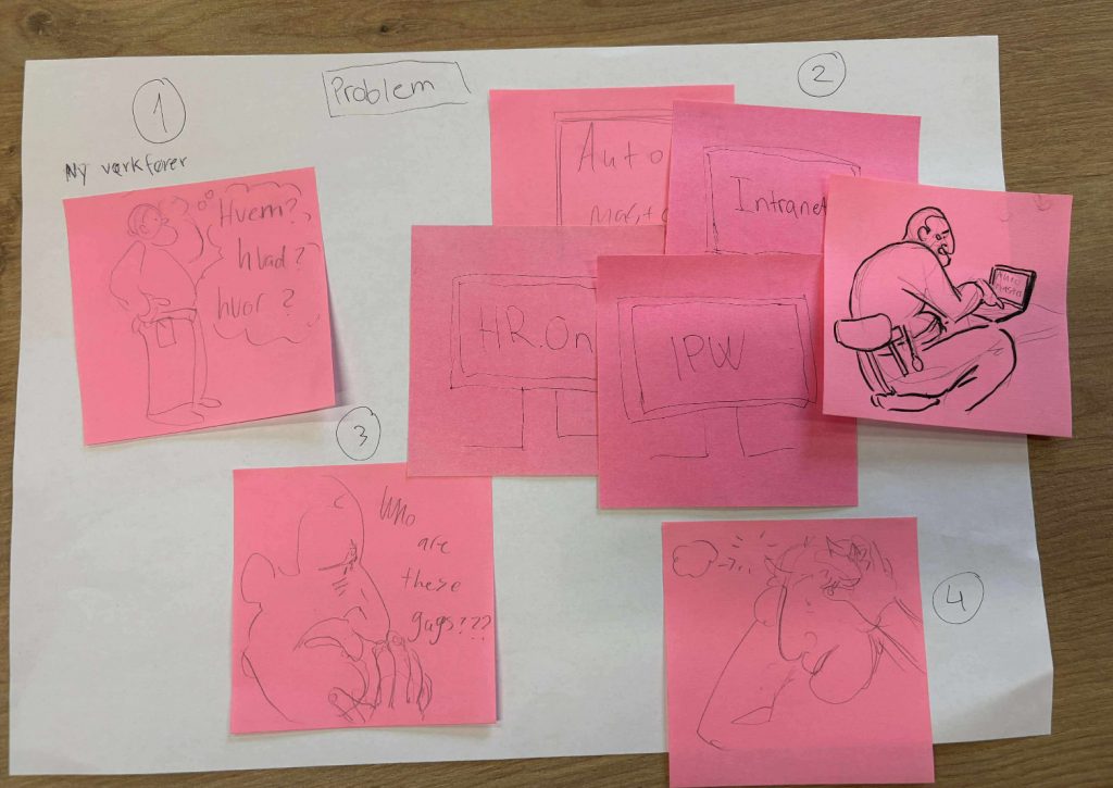 - Vi startede med at notere og skitsere, hvordan vi i starten af videoen ville adressere vores problemet, ved at tage højde for vores HMW-spørgsmål: