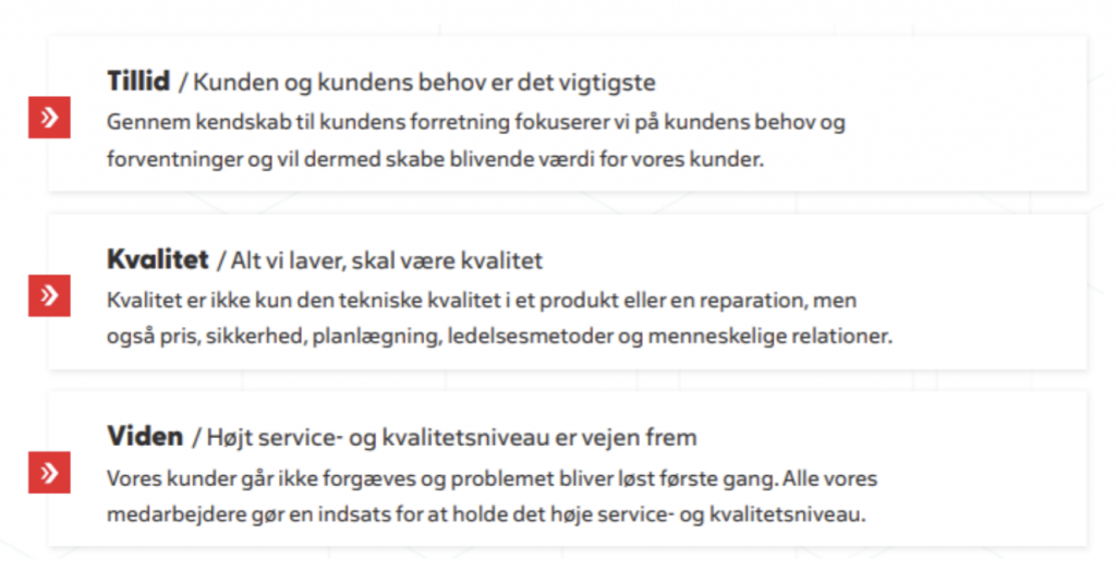 - Kerneværdierne er tillid, kvalitet og viden og de er fundamentet for alt de gør.