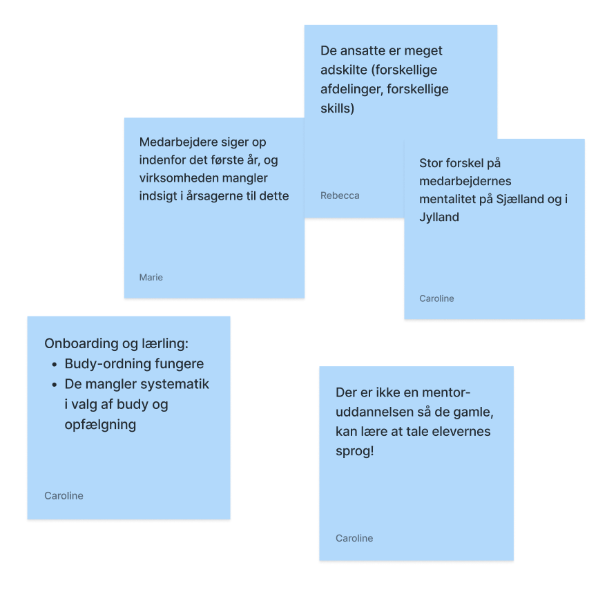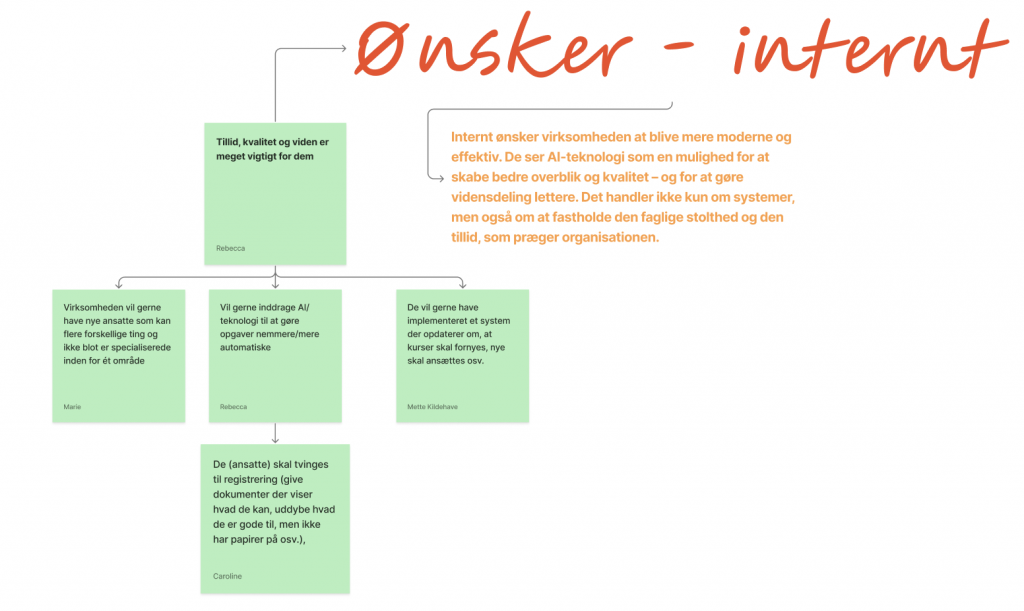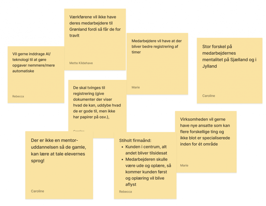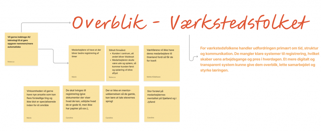 - Derudover savner de et system til at holde styr på ferie, sygdom og fravær, da det påvirker planlægning, trivsel og tillid. Her kunne AI bruges til at skabe overblik over kompetencer og tilgængelighed, så viden ikke forsvinder, hvis fx en værkstedsfører er væk.