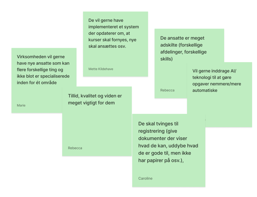 - HR og værkstedsfolkene er generelt enige i vores prioritering og opsætning. HR fokuserer på anvendelse og planlægning og ønsker, at løsningen skal være enkel med få steps og kunne integreres med deres HR-On system. De ser potentiale i at bruge mere data om medarbejdernes kompetencer – også selvvurderede – men påpeger, at nogle medarbejdere vil være mindre motiverede for at deltage, hvilket vi skal finde en løsning på.
