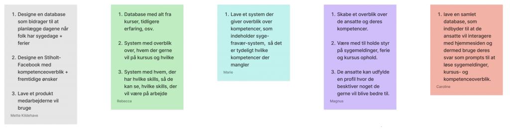 - Vi gjorde det dog lidt på vores egen måde, da vi alle skrev mellem 1-3 HMW-spørgsmål og lavede et HWM-diagram, så snakkede vi om dem og fandt ud af, at vi alle var meget enige og de samme ideer gik igen. Derfor gik vi videre og begyndte at lave wireframes.