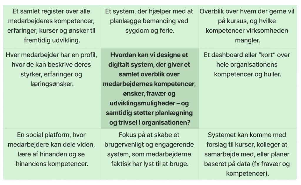 - Vi satte os og begyndte på vores idegenerering, hvor vi brugte HMW-spørgsmål til at komme med ideer.
